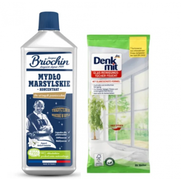 Цей набір поєднує зручність щоденного прибирання та силу натуральних компонентів. Вологі серветки Denkmit дозволяють швидко навести чистоту на скляних поверхнях без розводів, а марсельське мило Briochin забезпечує універсальне очищення та догляд за різними поверхнями й текстилем.