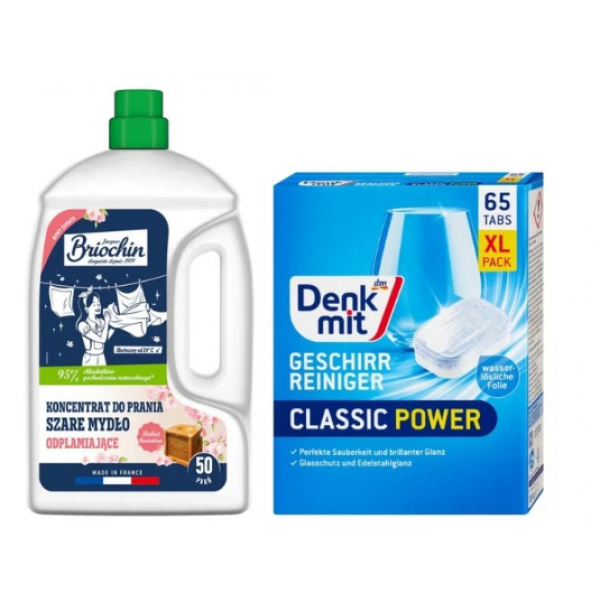 Цей набір поєднує два важливі напрямки побутового догляду: ефективне миття посуду та якісне прання одягу. Denkmit Classic забезпечує блиск і чистоту посуду без попереднього замочування, а Briochin із сірим милом — глибоке очищення тканин навіть при складних забрудненнях.