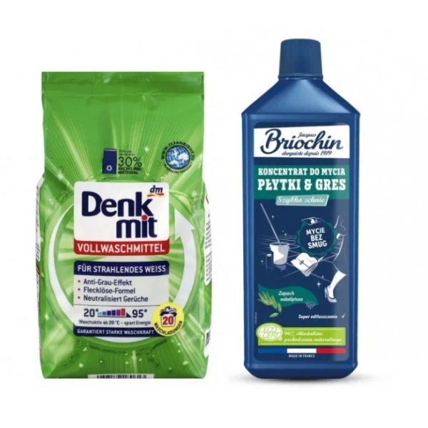 Набір Denkmit + Briochin — це практичне рішення для комплексного догляду за домом. Поєднання потужного прального порошку для білої білизни та ефективного концентрату для миття плитки допомагає підтримувати чистоту речей і підлоги, роблячи прибирання простішим та ефективнішим.