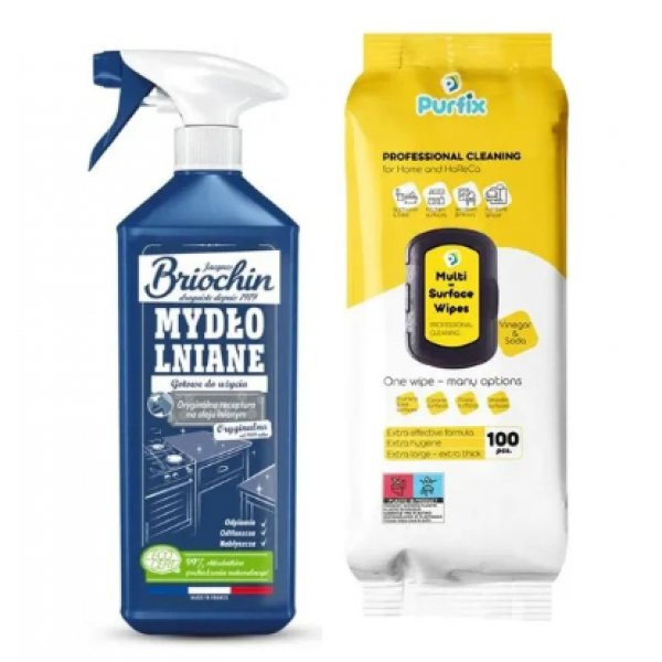 Цей набір — ідеальне рішення для тих, хто хоче підтримувати чистоту в домі швидко, зручно та без агресивної хімії. Вологі серветки Purfix забезпечують миттєве очищення поверхонь, а лляне мило Briochin додає глибоке натуральне очищення для більш складних завдань.
