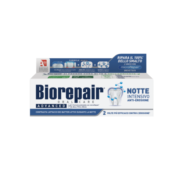 Пока вы спите, Biorepair Night работает: высокая концентрация microRepair® (цинк‑гидроксиапатит) взаимодействует со слюной, «запаивая» микротрещины, укрепляя дентинные канальцы и создавая гладкий минеральный слой, устойчивый к кислотным атакам следующего дня. Комплекс цинка, провитамина B5 и экстракта алоэ вера успокаивает дёсны, уменьшает биоплёнку и нейтрализует утренний запах.