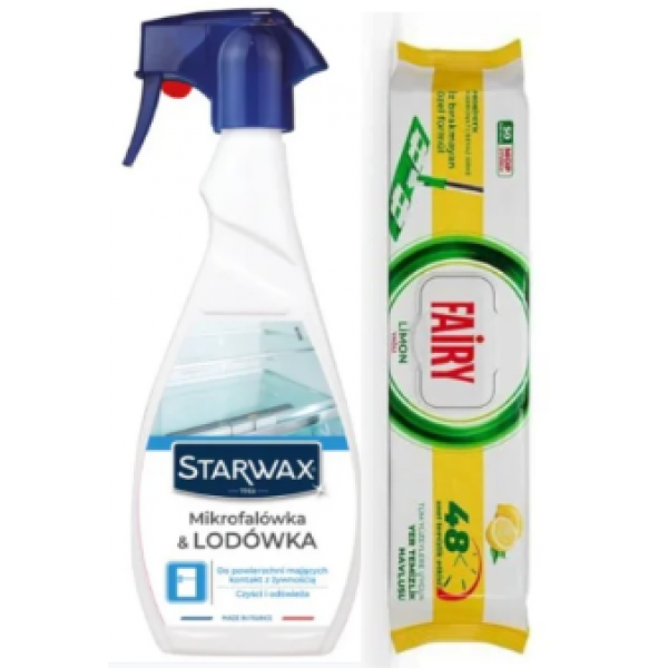 Влажные салфетки Fairy уже пропитаны активной моющей формулой, которая легко удаляет пыль, следы грязи, жир и другие повседневные загрязнения, не оставляя разводов и липкости. Они подходят как для ручной уборки, так и для использования со швабрами. Средство Starwax разработано для очистки холодильников, микроволновых печей и морозильных камер — оно не содержит хлора, безопасно для поверхностей, контактирующих с продуктами, и эффективно устраняет жир, остатки пищи и неприятные запахи.